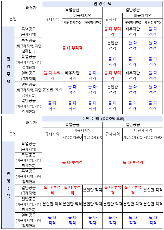 아래 표는 부부 중복신청 시 당첨여부를 정리한 표로 아래 표에서 부부 '둘 다 부적격'인 경우에는 금번 개정에 따라 선 신청분은 유효하되, 후 신청분은 무효처리, 부부가 아닌 세대원이 중복당첨된 경우 기존과 동일하게 모두 부적격처리됩니다.