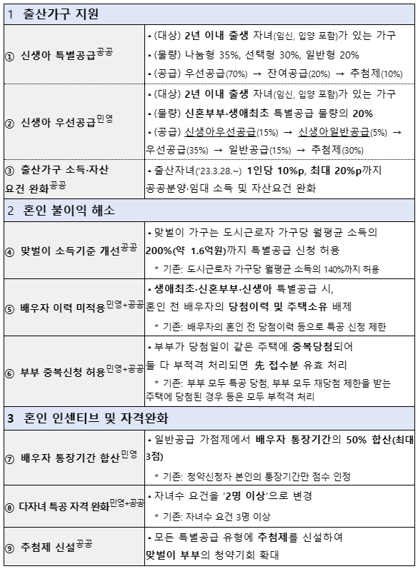↳ (뉴:홈 신혼특공) 소득: 月 최대 1,154만 원 → 1,319만 원, 자산: 362백만 원 → 431백만 원